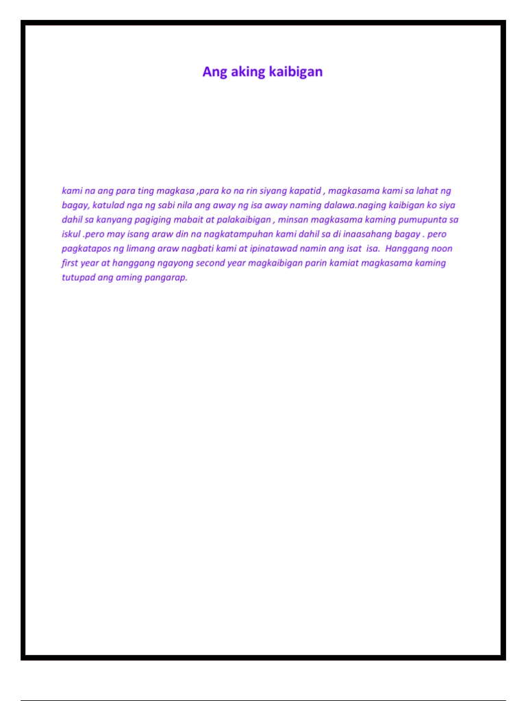 Ngunit nag kakasundurin at nagdadamayan sa mga problema. Para sa akin maraming ibig sabihin ng kaibigan kaibigan sa kasiyahan lang or sa gimmick lang kaibigan kapag may kailangan lang sayo kaibigan lang sa tsismisan kaibigan lang na may makakasama at makaka-usap kaibigan lang siya kapag may nakukuha sayo. Sa isang araw siyam na oras akong nakaupo sa aking upuan habang nakikinig sa aking guro.